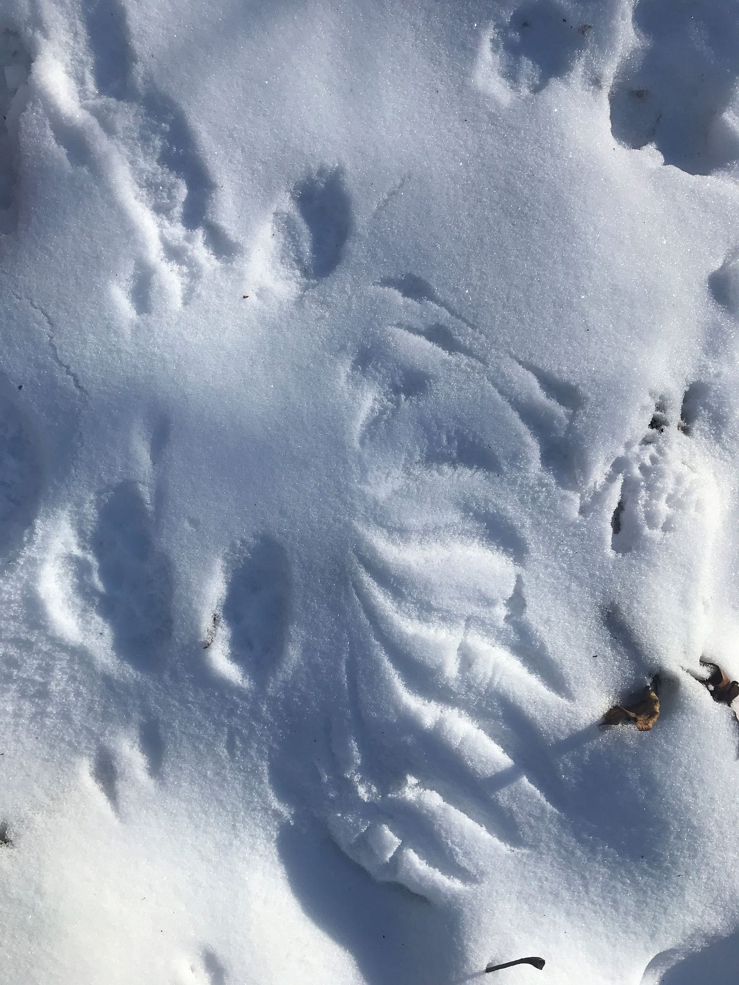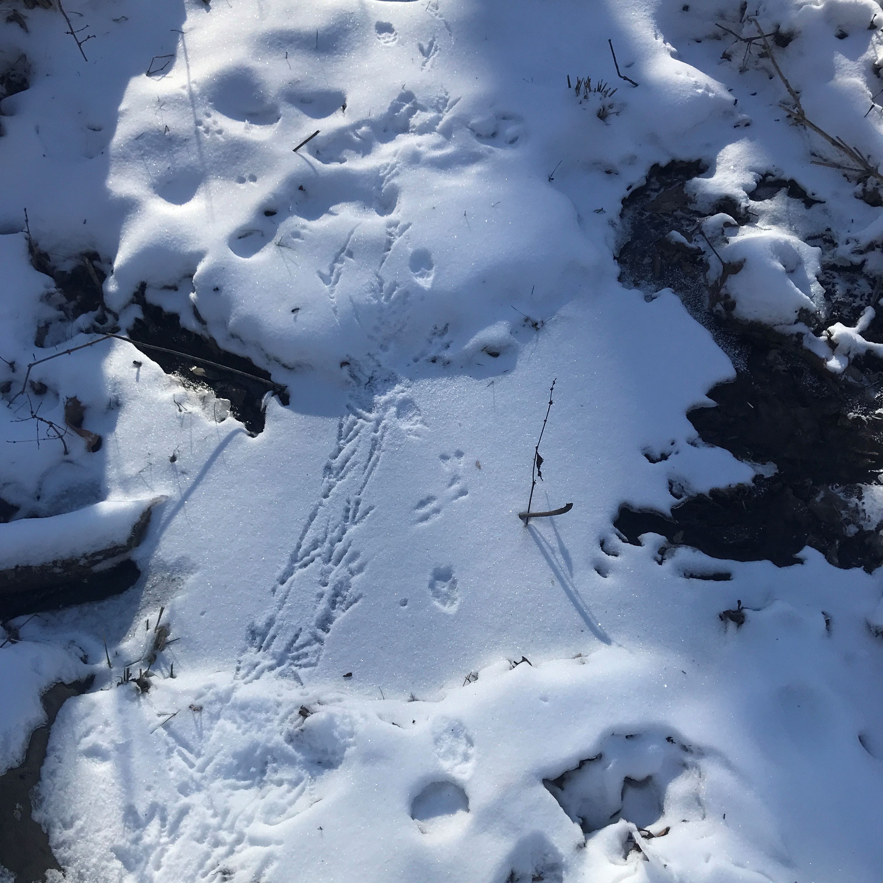 Just as the sun came up, the snow stopped, and the wind moved on. It was so bitterly cold, though, the only hope of staying warm was to just keep moving - quickly. I wanted to check the fence line for any trees that might have come down in the storm, and I was indeed making great time. When I crossed the stream, though, a series of tracks caught my eye. Pleased to see that I wasn’t the only one out doing chores in the freezing cold, I paused for a while to look at the storyboard recorded in the snow.